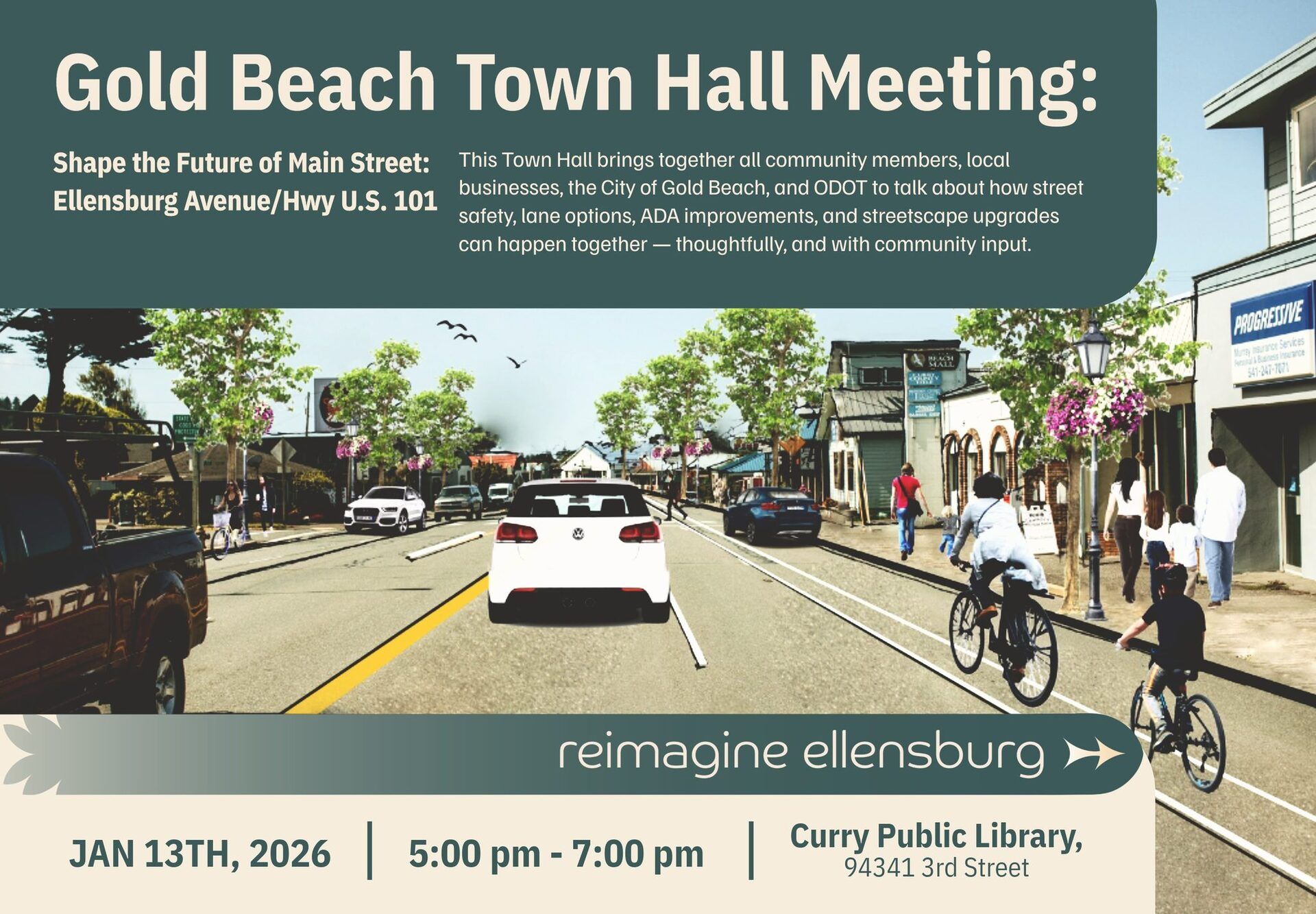 Gold Beach Main Street is hosting an in-person town hall to discuss Ellensburg Avenue and the downtown corridor, including updates on the Gold Beach U.S. 101 Community Connections Plan.
